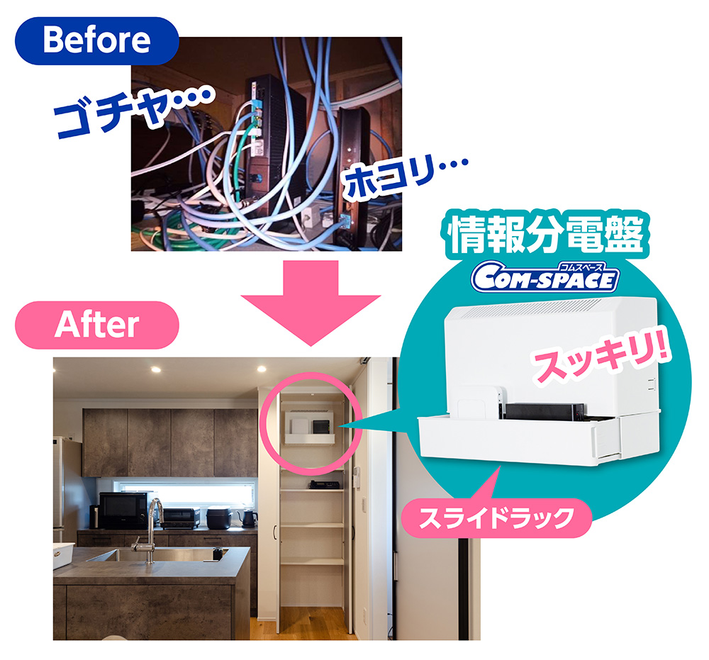 新築時にLAN配線を先行しても、通信機器が下駄箱や屋根裏などに雑然と置かれてしまうと、管理が行き届かなくなります。そこで「情報分電盤」を設置し、テレビ・インターネット・電話などの関連機器を一か所に集約することで、美観を損なわず、将来的な機器の追加にも柔軟に対応できます。スライドラック付きの情報分電盤を選べば、収納力が高く、機器の管理も簡単です。