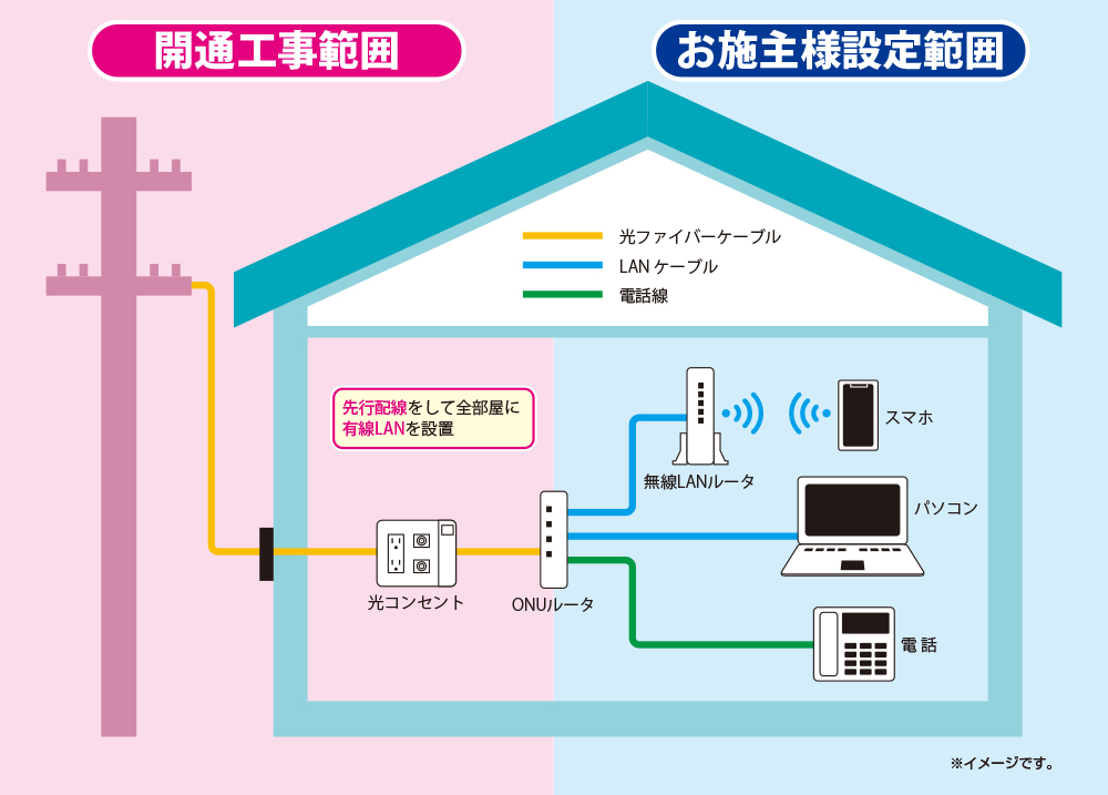 住宅内のネットワーク化には、有線LANと無線LANを利用する方法があります。全部屋にLANモジュラジャックを設置することで、有線LAN接続・Wi-Fi接続をご自身で選べる状態にする必要があります。