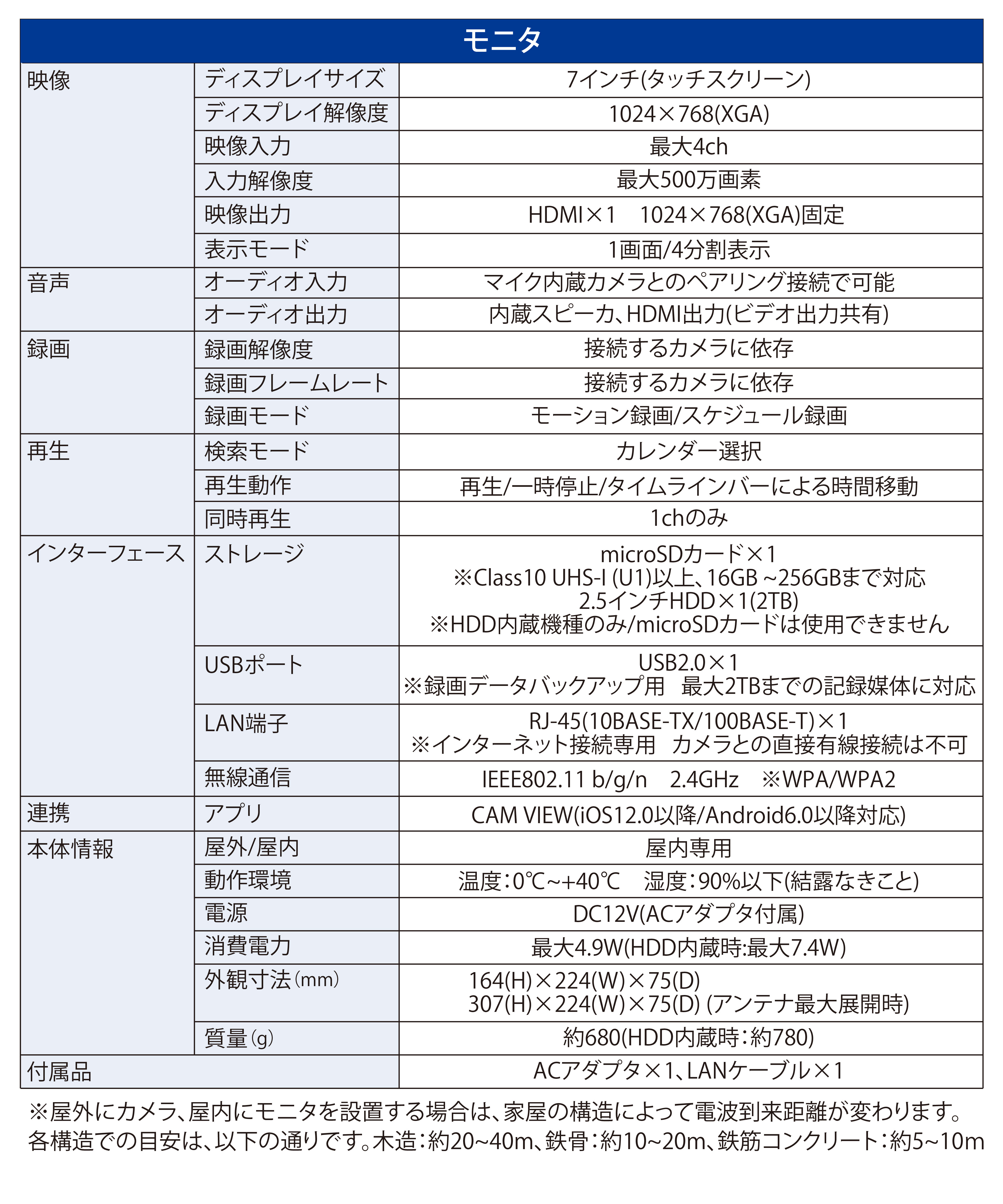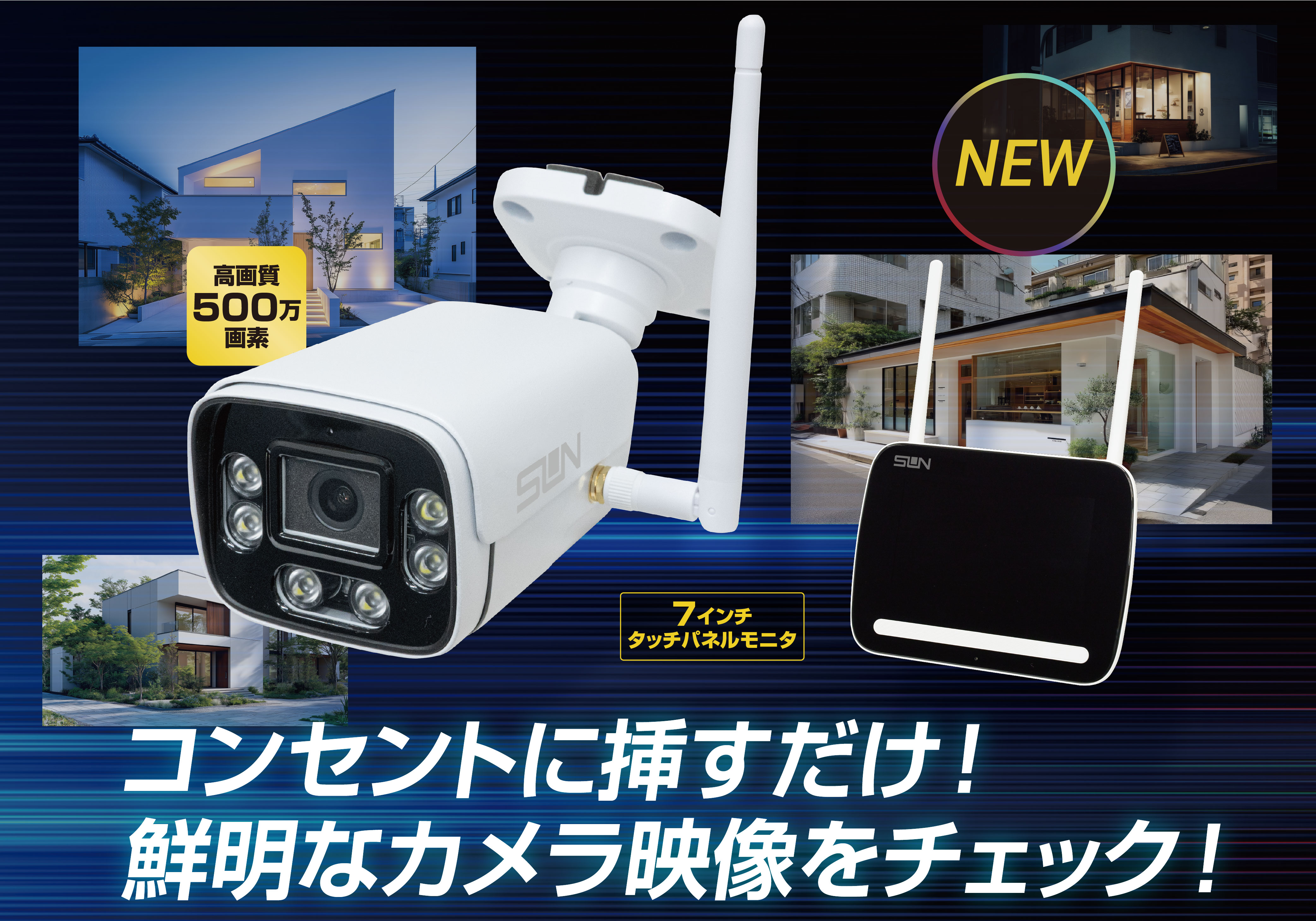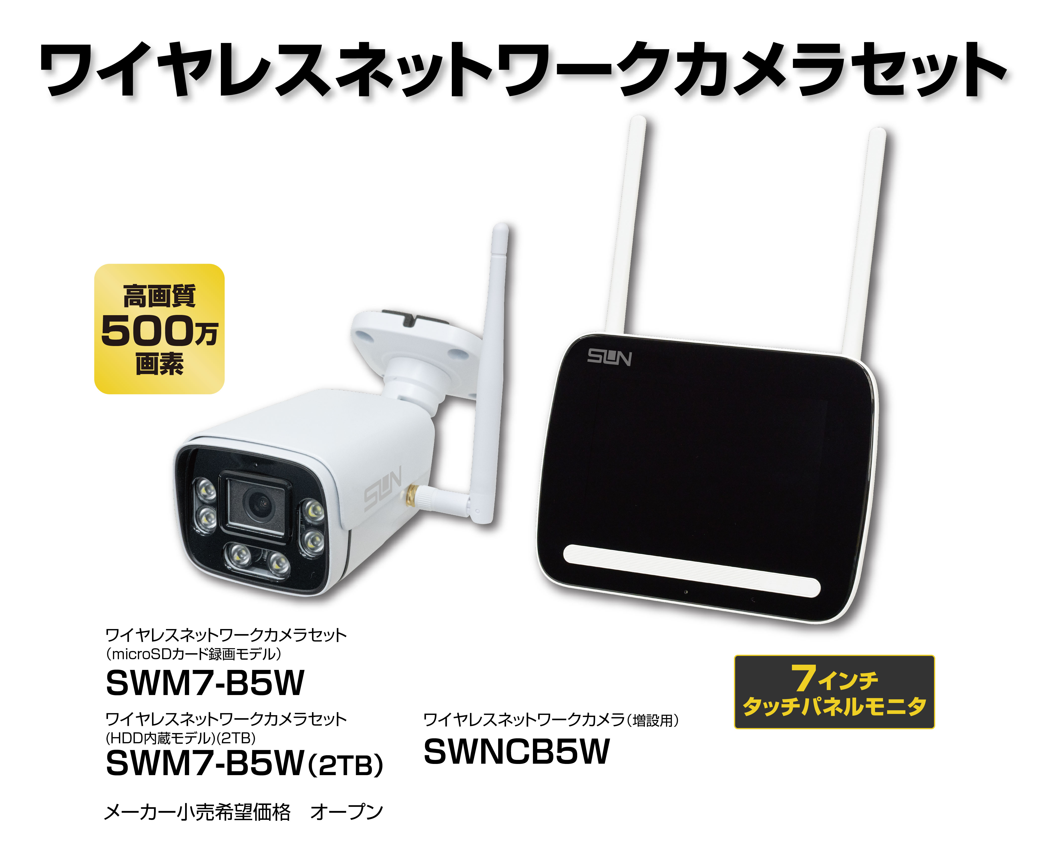 当商品は、500万画素の高画質で録画ができるワイヤレスネットワークカメラと7インチのタッチパネルモニタがセットになった商品です。インターネット環境がなくても利用することができ、長時間録画にも対応しています。その他、夜間撮影はもちろんのこと、センサーライト機能、アプリでの遠隔監視・操作(※ネット環境が必要)、さまざまな機能を搭載したカメラセットとなっています。