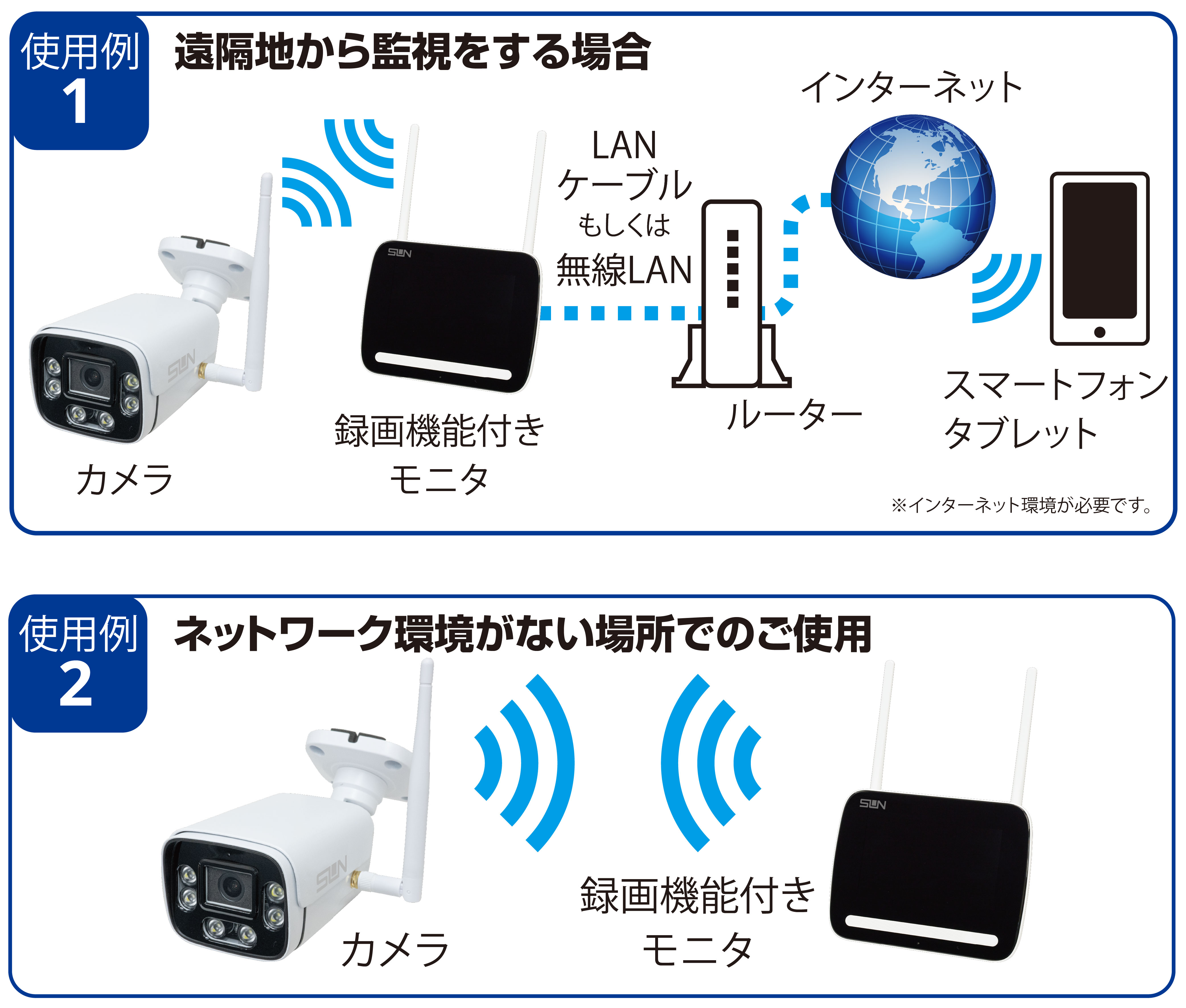 モニタとカメラは、壁や障害物にも強い2.4GHz帯の無線LANに接続することができ、インターネット環境がなくてもご利用いただけます。